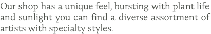 Our shop has a unique feel, bursting with plant life and sunlight you can find a diverse assortment of artists with specialty styles.