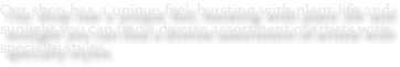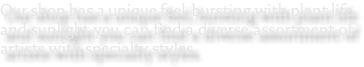 Our shop has a unique feel, bursting with plant life and sunlight you can find a diverse assortment of artists with specialty styles.