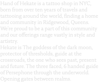 Hand of Hekate is a tattoo shop in NYC, born from over ten years of travels and tattooing around the world, finding a home and community in Ridgewood, Queens. We're proud to be a part of this community and our offerings range vastly in style and artistry. Hekate is The goddess of the dark moon, protector of thresholds, guide at the crossroads, the one who sees past, present and future. The three faced, 6 handed guide of Persephone through the underworld. Opening gates between realms.